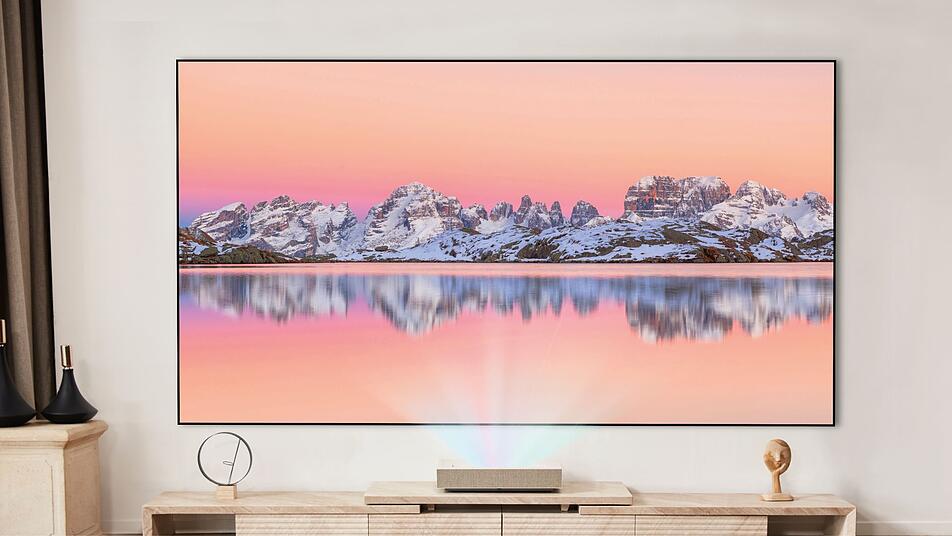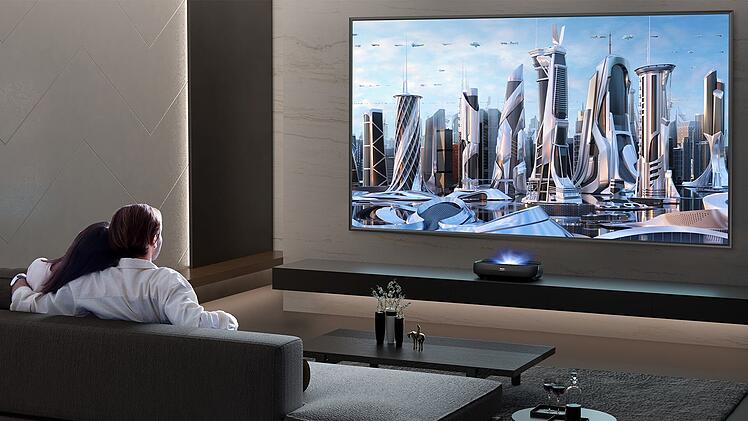 Laser-TV-Geräte strahlen das Bild glasklar auf eine weiße Wand oder auf eine für die noch relativ junge Technologie ausgelegte Leinwand. Ein Vorteil ist, dass man für ein 100 Zoll-Bild weniger ausgeben muss, als für ein herkömmliches Smart-TV-Gerät in gleicher Größe. Das Laser-TV-Gerät strahlt mit sehr geringem Abstand zur Projektionsfläche das TV-Bild in entsprechender Größe auf den Hintergrund.