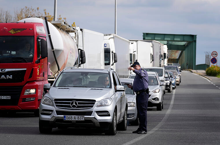 Ein Polizist leitet den Verkehr am Grenzübergang Stara Gradiska zwischen Kroatien und Bosnien und Herzegowina, als das Einreise-/Ausreisesystem (EES) eingeführt wird, das alle Nicht-EU-Bürger ...