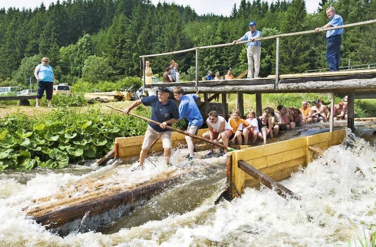 Einen Sprung ins kalte Wasser wagen Besucher sprichwörtlich bei den sommerlichen Floßfahrten auf der Wilden Rodach im Naturpark Frankenwald. Bis 27. August legen an der Floßlände Schnappenhammer bei Wallenfels immer samstags bis zu 25 Holzfloße ab, die sich ihren Weg durch das enge Tal der Wilden Rodach bahnen. Bei den fröhlichen Floßfahrten reist ein großes Stück Tradition mit, war doch die Flößerei über 800 Jahre einer der wichtigsten Erwerbszweige der Region.