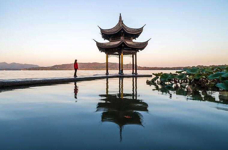 Urlaub in China: Sonnenaufgang am malerischen Westsee in Hangzhou