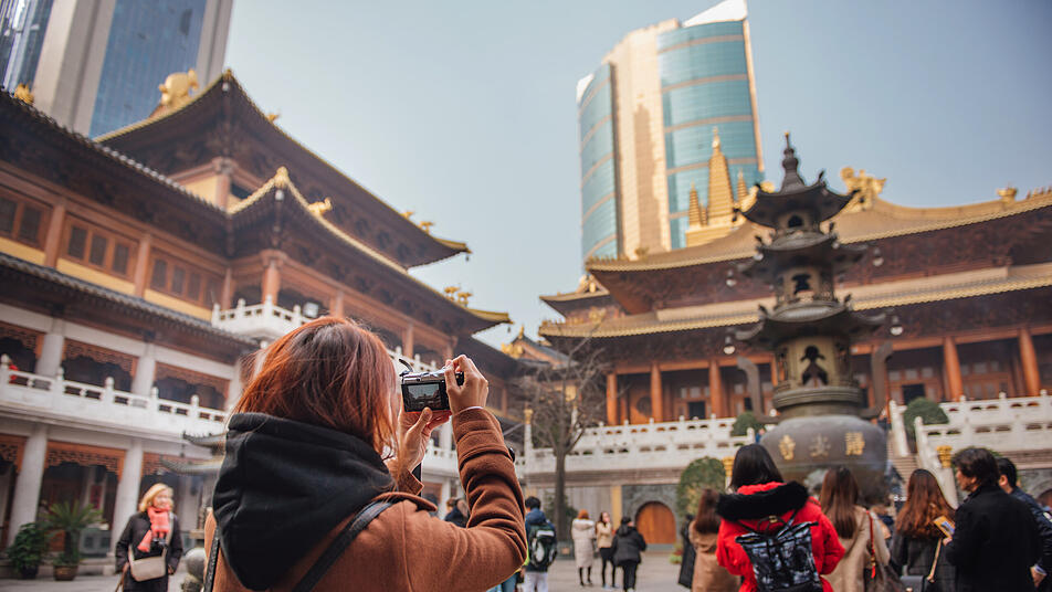 Urlaub in China: Touristin fotografiert Jing'an-Tempel in Shanghai