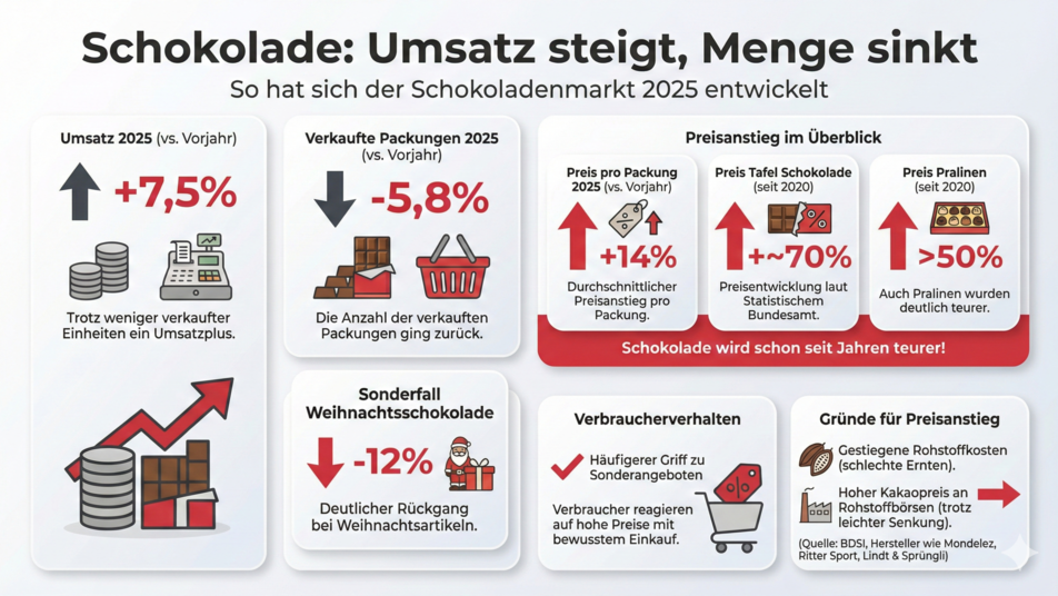 Der Umsatz mit Schokoladenwaren stieg 2025 im Vergleich zum Vorjahr zwar um 7,5 Prozent, die Zahl der verkauften Packungen ging jedoch um 5,8 Prozent zurück, bei Weihnachtsschokolade sogar um 12 Prozent.
