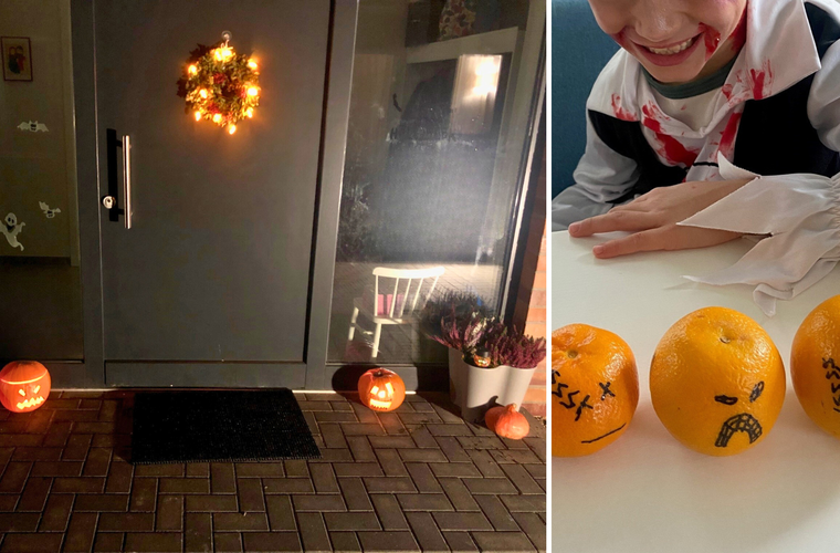 In die Süßigkeiten investiere ich ein paar Euros mehr, weil die ganz billigen Sachen einfach nicht schmecken und die Kleinen sich riesig freuen, wenn sie etwas Süßes großer Süßwarenmarken in ihre Sammeltüten packen können. Wenn etwas übrigbleibt, opfere ich mich selbstlos auf. Damit andere Kinder auch wissen, dass es bei uns etwas zu holen gibt, sieht unsere Halloween-Deko vor der Haustür folgendermaßen aus: Mandarinen, denen wir gruselige Gesichter mit einem wasserfesten Stift aufgemalt haben, ausgehöhlte Kürbisse mit Fratzen und Teelichtern darin, dazu noch weiße sowie rote Grabkerzen.