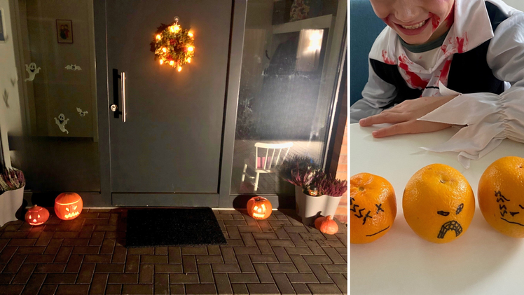 In die Süßigkeiten investiere ich ein paar Euros mehr, weil die ganz billigen Sachen einfach nicht schmecken und die Kleinen sich riesig freuen, wenn sie etwas Süßes großer Süßwarenmarken in ihre Sammeltüten packen können. Wenn etwas übrigbleibt, opfere ich mich selbstlos auf. Damit andere Kinder auch wissen, dass es bei uns etwas zu holen gibt, sieht unsere Halloween-Deko vor der Haustür folgendermaßen aus: Mandarinen, denen wir gruselige Gesichter mit einem wasserfesten Stift aufgemalt haben, ausgehöhlte Kürbisse mit Fratzen und Teelichtern darin, dazu noch weiße sowie rote Grabkerzen.