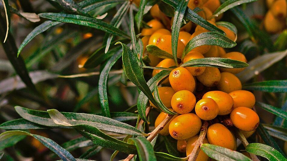 Sanddornbeeren enthalten viel Vitamin C. Das Öl der Pflanze unterstützt die Hautpflege und kann bei verschiedenen Beschwerden wie Entzündungen und Verdauungsproblemen helfen.