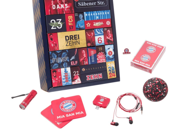 Auch ein spezieller FC Bayern Adventskalender für Kinder* ist dieses Jahr dabei. Dieser enthält Produkte, die sich besonders für Kinder eignen, beispielsweise Schreibutensilien für die Schule, Sticker, eine Trillerpfeife, ein Armband oder ein Puzzle. Der Adventskalender ist mit den Lieblingsspielern der Kids verziert, die jeden Tag eine neue Überraschung bereit halten.