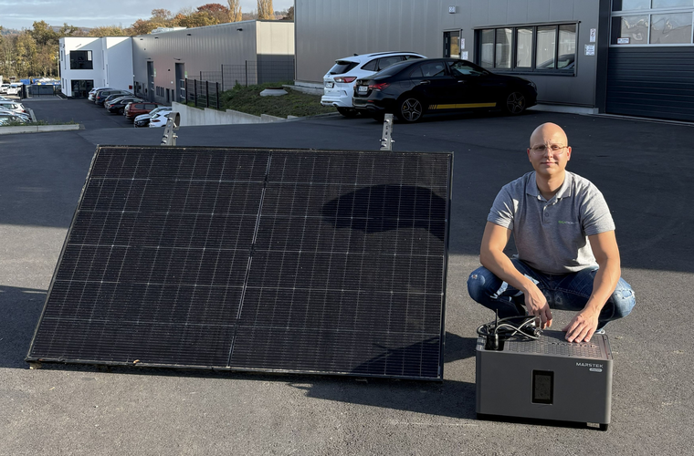 Malik Cakmak präsentiert auf den Fotos innovative Balkonkraftwerke und Speichersysteme – Technik, die Zukunft schafft. Hier mit dem Jupiter C+ im XXL-Speicherset.