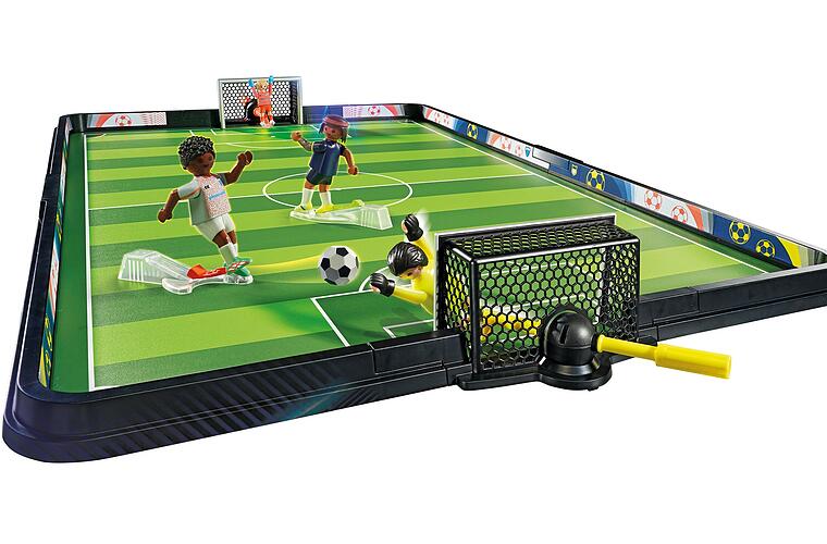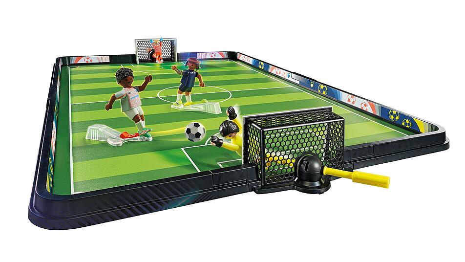 Vom 20. November bis zum 18. Dezember 2022 heißt es für die Spieler der qualifizierten Nationen wieder: Anstoß zur WM. Auch wenn große Fußballfeste eher mit dem Sommer konnotiert sind, ist das kein Grund nicht auch ein bisschen Fußballstimmung zur Weihnachtszeit in die eigene Wohnung zu holen. Mit der Fußball-Arena von Playmobil können eigene Spiele ganz individuell im Kinderzimmer nachgespielt werden. Die 97 cm lange, 67 cm breite und 9,5 cm hohe Arena bietet viel Platz für Dribblings und intensive Zweikämpfe. Die simple Kick-Funktion der mitgelieferten Spieler ist ein Actiongarant, da so ein schneller Spielablauf und sowohl die Platzierung von flachen und hohen Bällen möglich ist. Playmobil bietet durch Mitlieferung von Etikettenbögen für Namen und Spielernummern eine Möglichkeit zur Individualisierung des Spiels an.