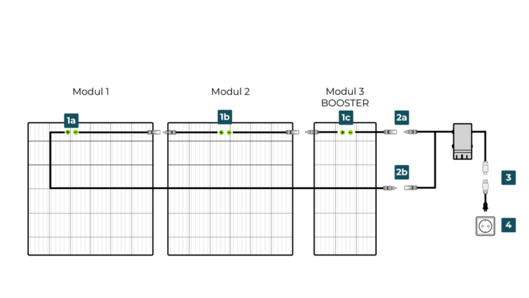 Das BOOSTER Solarmodul von PluginEnergy kann ganz einfach in die Reihenschaltung deines Balkonkraftwerks integriert werden.