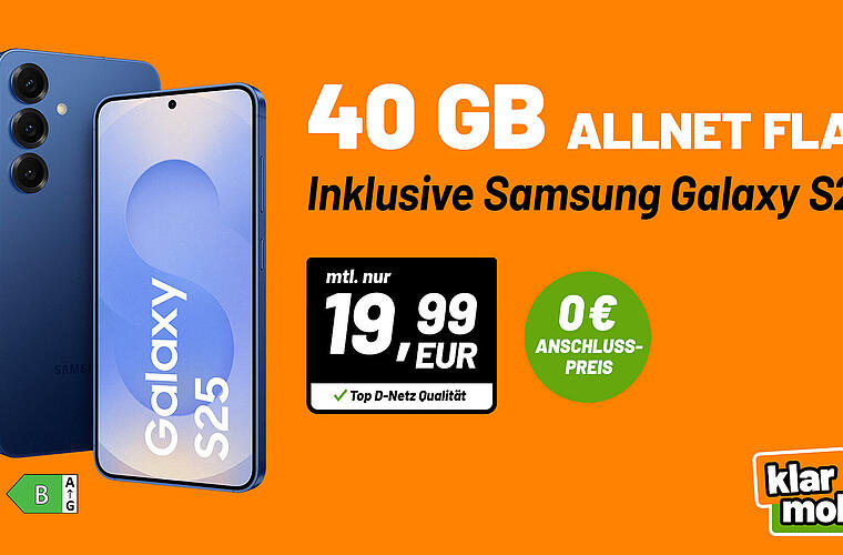 Nur für kurze Zeit gibt es bei klarmobil das starke Galaxy Allnet Flat Tarif-Bundle*: Für nur 19,99 Euro im Monat holst du dir das Samsung Galaxy S25 und dazu einen riesigen Tarif mit 40 Gigabyte Datenvolumen im Vodafone-Netz.