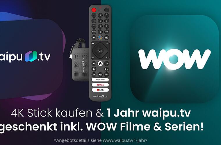Mit dem waipu.tv 4K Stick erlebst du über 300 TV-Sender und WOW Filme & Serien ein Jahr lang gratis.