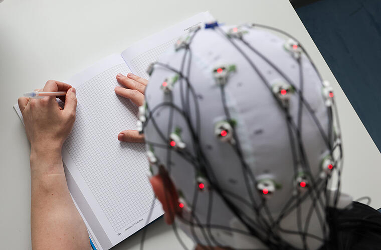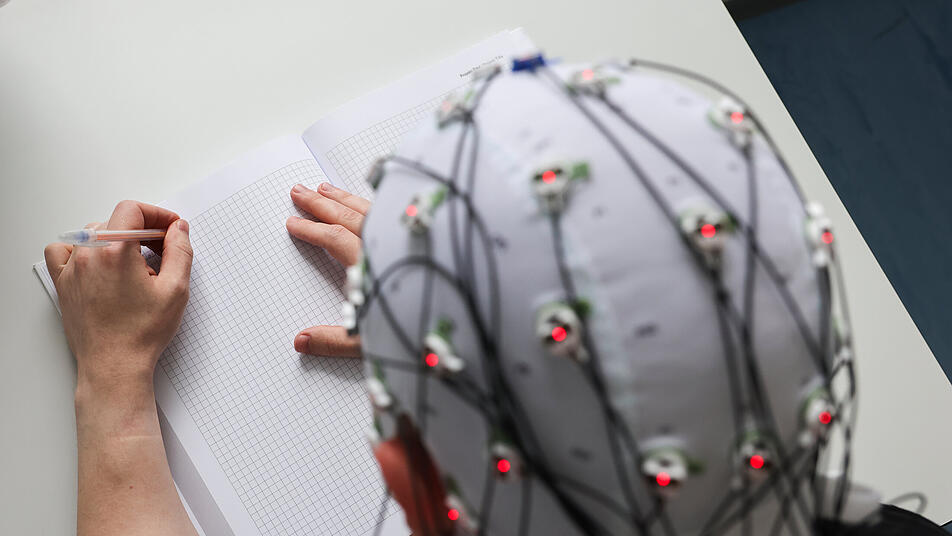 Ein Mitarbeiter der MSH Medical School Hamburg trägt eine mobile EEG-Haube zum Messen der Hirnströme beim Schreiben mit der linken Hand in einem Laborraum der MSH in der Hafencity. Am 13 ...