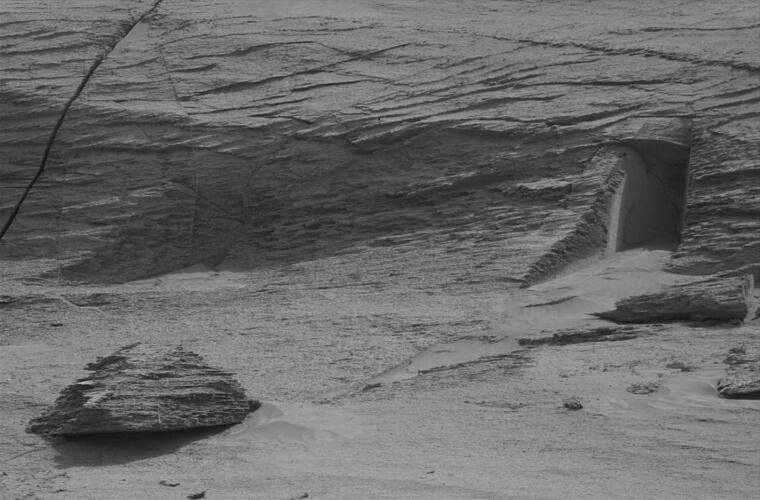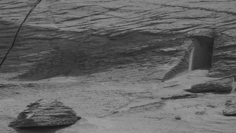 Ein Rover der US-Weltraumbehörde Nasa hat auf dem Mars eine Aufnahme gemacht, die einen künstlich geschaffenen Eingang in einer Felsenwand zu zeigen scheint. Die Nasa lässt das Bild unkommentiert - und damit reichlich Platz für außerirdische Theorien.