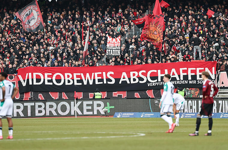 Mit einem Banner mit der Aufschrift "Videobeweis abschaffen - verpfiffen werden wir sowieso" fordern die Fans des 1.FC Nürnberg das Ende des Videobeweises.