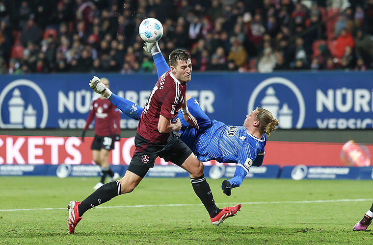 Fynn Lakenmacher von Darmstadt 98 (r.) versucht mit einem Fallrückzieher, über Robin Knoche vom FCN hinwegzuschießen ...