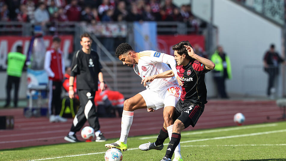 Emmanuel Iyoha von Fortuna Düsseldorf (l) und Tom Baack vom 1. FC Nürnberg in Aktion: Das Max-Morlock-Stadion war seit Oktober eine Festung, doch Fortuna Düsseldorf beendet die beeindruckende ...