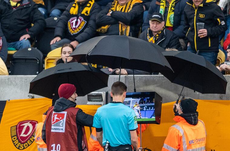 Bemüht der Schiedsrichter den Videobeweis - wie hier jüngst Benjamin Cortus im Rudolf-Harbig-Stadion beim 1:1 zwischen Dresden und Sandhausen in der 2. Liga, dann verhagelt diese Maßnahme oft die Stimmung von Spielern und Zuschauern. Foto: Robert Michael/dpa