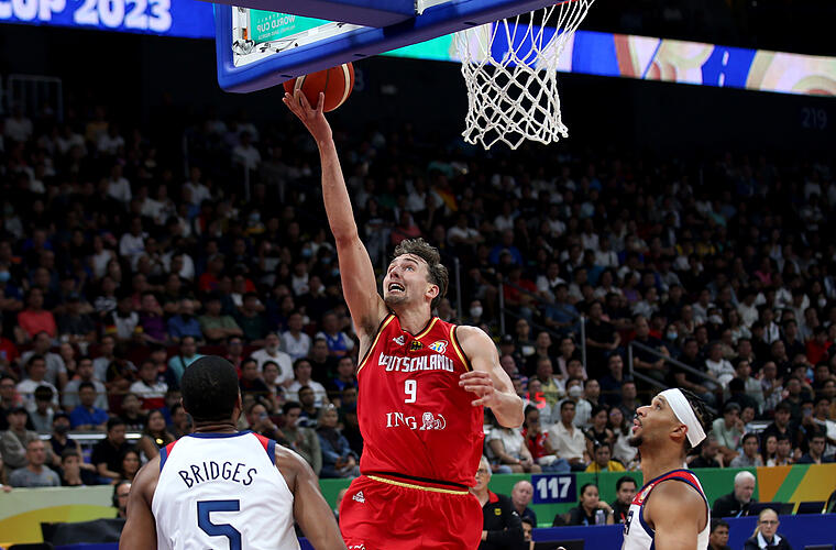 Doch auch die USA, die ohne Superstars wie Stephen Curry und LeBron James in Asien antreten, boten in der Offensive Höhepunkt um Höhepunkt. Das hochveranlagte Flügelduo Mikal Bridges und Anthony Edwards befand sich im Angriffsmodus und traf hochprozentig. Beide Stars hatten schon zur Halbzeit 15 Zähler. Doch das Spiel konnten sie zunächst genauso wenig auf die US-Seite ziehen wie Dreierspezialist Austin Reaves, der beinahe in diesem Sommer bei Deutschland eingebürgert worden wäre. Es war spannend wie beim Vorbereitungsspiel in Abu Dhabi, als die Deutschen Mitte August nach einer 16-Punkte-Führung noch 91:99 verloren.