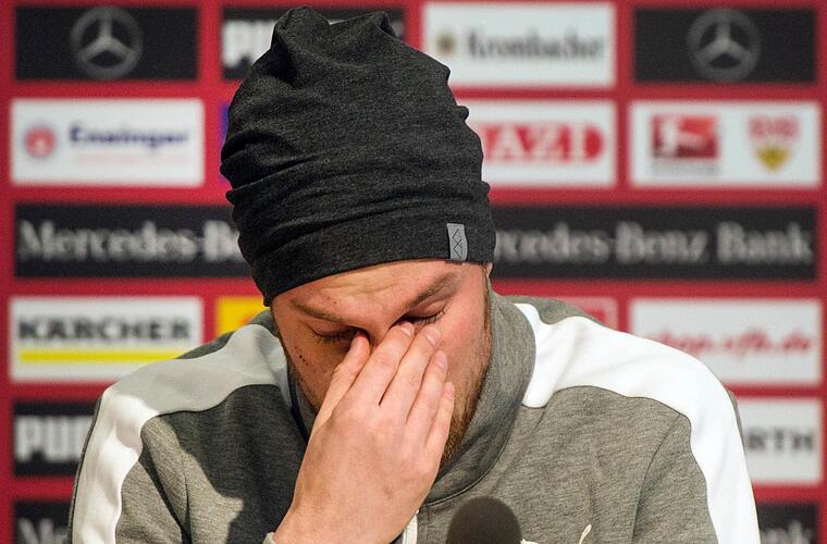 Tränenreich verabschiedet sich Fußballspieler Kevin Großkreutz auf der Pressekonferenz vom Verein und den Fans des VfB Stuttgart.