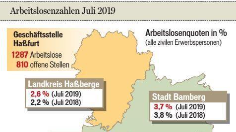 LKR HaßbergearbeitsmarktDynamik lässt etwas nachDie Arbeitslosigkeit im Landkreis Haßberge ist von Juni auf Juli um 41 Personen auf 1287 Erwerbslose gestiegen. Diese und weitere Zahlen gab die Agentur für Arbeits in ihrem Monatsbericht für den Juli... 31.07.2019