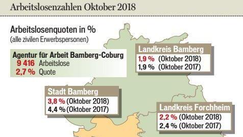 ForchheimArbeitsmarktNiedrigste Arbeitslosigkeit seit 1980 gemeldetDie Zahl der Arbeitslosen verringerte sich im Agenturbezirk Bamberg-Coburg, zu dem auch Stadt und Landkreis Forchheim gehören, im Oktober um 457 Personen (4,6 Prozent) auf 9416. Sie liegt nun wieder u... 30.10.2018