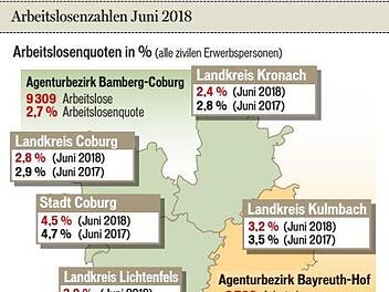 KulmbachBeschäftigungKulmbacher Arbeitsmarkt zielt in Richtung VollbeschäftigungIm Bereich der Arbeitsagentur Bayreuth-Hof waren im Juni 8509 Männer und Frauen von Arbeitslosigkeit betroffen. Das waren 320 weniger als im Mai. 29.06.2018