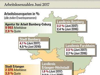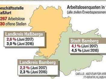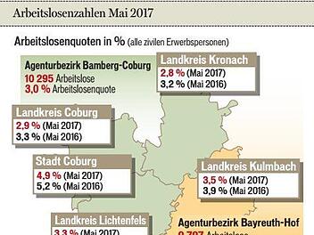Lichtenfels27 Menschen fanden eine StelleDie Arbeitslosigkeit ist im Juni im Agenturbezirk Bamberg-Coburg zum ersten Mal seit 1980 unter die 10 000er-Marke auf 9993 Personen gesunken. Die Arbeitslo... 02.07.2017