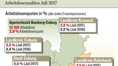 KronachÜblicher Anstieg der Jugendarbeitslosigkeit vor den SommerferienTrotz des jahreszeitlich bedingt leichten Anstiegs der Beschäftigungslosigkeit, blieb die Arbeitslosenquote im Agenturbezirk Bamberg-Coburg im Juli unveränd... 02.08.2017