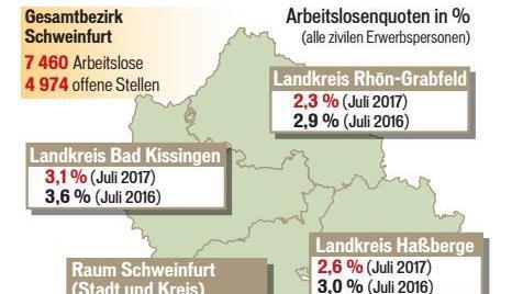 Bad KissingenArbeitsmarktQuote erneut bei drei Prozent im JuliDie Arbeitslosenquote erreichte erstmals in einem Juli 3,0 Prozent. 01.08.2017