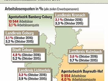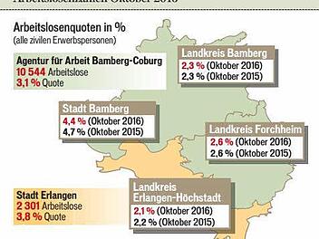 ForchheimDer Herbstaufschwung legt im Kreis Forchheim kräftig zuIm Oktober 2016 ist die Arbeitslosigkeit im Agenturbezirk Bamberg-Coburg weiter zurückgegangen, und zwar auf 10 544. Die Arbeitslosenquote beträgt 3,1 Proze... 02.11.2016