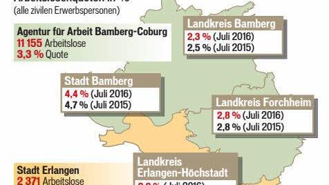 Höchstadt a. d. AischArbeitslosigkeit bleibt niedrigDie Arbeitslosenquote im Landkreis Erlangen-Höchstadt bleibt auch im Juli auf niedrigem Niveau: Die Vorjahresquote von 2,2 Prozent wurde erneut erreicht. Ei... 28.07.2016