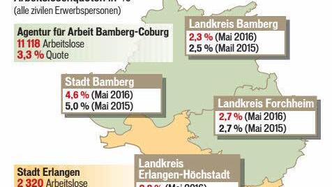 ForchheimIm Landkreis Forchheim herrscht VollbeschäftigungDie Zahl der Arbeitslosen hat im Landkreis Forchheim gegenüber dem Vormonat um 115 Personen auf 1798 abgenommen. Das entspricht einem Minus von sechs Prozen... 31.05.2016