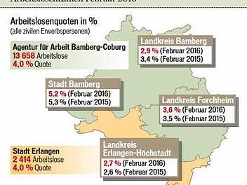 KulmbachStatistikAuf dem Arbeitsmarkt ist schon FrühlingNicht nur auf dem Kalender, auch auf dem Arbeitsmakrt herrscht bereits Frühling. Die Arbeitslosenquote in Kulmbach blieb stabil bei 4,8 Prozent. 01.03.2016