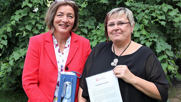 VolkachNamen & Notizen:Marion Schley feierte 25-jähriges DienstjubiläumMarion Schley, Krankenschwester und Geronto-Fachkraft im Bürgerspital Altenheim der Caritas in Volkach, feierte ihr 25-jähriges Dienstjubiläum. Der verheirateten Mutter von zwei Kindern aus dem Kolitzheimer Ortsteil Stammheim gratulierte Einrichtungsleitern Ulrike Dietrich (links). Sie überreichte der Jubilarin die Urkunde der Caritas Einrichtungen, einen Wellness-Gutschein und ein Weinpräsent. Marion Schley trat 1994 als Krankenschwester in den Dienst des Bürgerspitals. 2001 absolvierte sie die Ausbildung zur Geronto-Fachkraft erfolgreich. Beim Stammheimer Frauenbund ist sie aktiv. Fit hält sie sich durch Radfahren und bei der Gymnastikgruppe. 17.06.2019