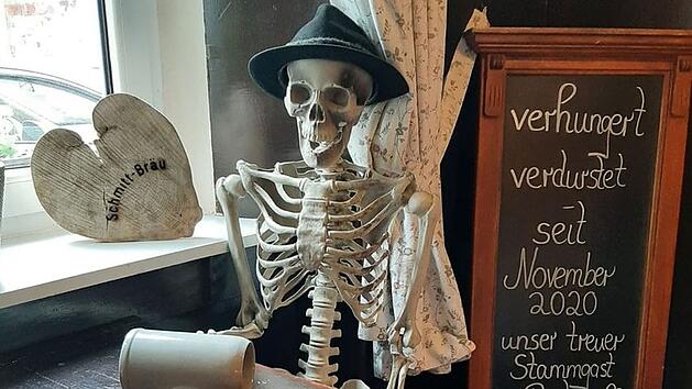 ScheßlitzDrastische Aktion"Verhungert und verdurstet": Gastwirtschaft schockt mit Grusel-Gast am TischEin Skelett ziert einen der Tische der Brauereigaststätte Schmitt-Bräu in Scheßlitz. Wirtin Diana Vogt will damit auf "ausgehungerte Gäste" und die unter dem Lockdown leidende Gastronomie aufmerksam machen. 4 20.04.2021