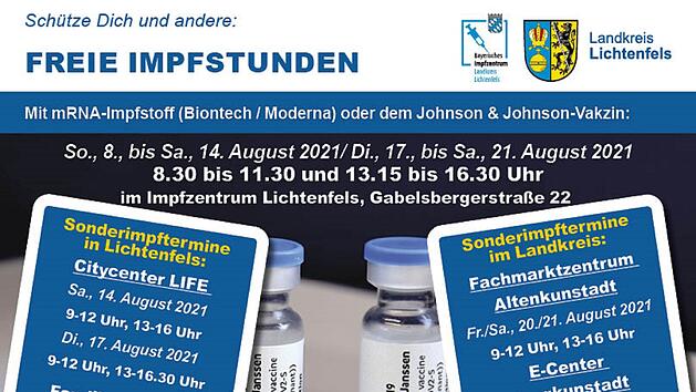 LichtenfelsCoronaLandkreis Lichtenfels: Impfzentrum hat "viele freie Termine" - Landkreis ruft zum "Familienimpftag" aufUm den Impfwilligen im Landkreis Lichtenfels den Zugang zu einer Impfung zu ermöglichen, werden weitere Sonderimpftermine angeboten. 13.08.2021