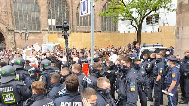 NürnbergCoronavirus"Wir sind das Volk!": Stimmung bei Corona-Demo in Nürnberg kocht hochAm Samstag haben Tausende Menschen in Nürnberg gegen die Coronavirus-Regeln protestiert. Video-Clips zeigen die Demonstranten, wie sie die Parolen "Wir sind das Volk" und „Widerstand“ rufen. Die Polizei spricht von "aggressiven Szenen" und besonderen Herausforderungen. 11.05.2020