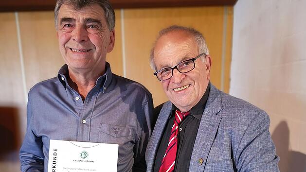 Sulzfeld„DFB-Sonderehrung“ für Finanzgenie Roland SüßmeierDa war die Überraschung groß. Während eines Vereinsabends des TSV Sulzfeld begrüßte 1. Vorstand Bernd Hering den DFB-Kreisehrenamtsbeauftragten des Fußballkreises Würzburg Ludwig Bauer (Gerbrunn). Dieser kündigte ein erfreuliches Ereignis an. Die höchste Ehrung des DFB für Vereinsmitarbeiter, die DFB-Sonderehrung, überreichte er im Auftrag des Deutschen Fußball-Bundes an Roland Süßmeier. Die Ehrung besteht aus einer nicht käuflichen DFB-Armbanduhr und einer Urkunde mit Unterschrift des DFB-Präsidenten und wird für vorbildliche und langjährige ehrenamtliche Leistungen im Fußballsport verliehen. In seiner Laudatio betonte Ludwig Bauer, dass sich Roland Süßmeier diese Ehrung durch seine Mitarbeit im Verein mehr als verdient habe. Bei Beginn seiner Tätigkeit trainierte und betreute er zahlreiche Jugendmannschaften des TSV. Er fungierte seit 1985 für 16 Jahre als Schriftführer und ist seit 1997 Stadionsprecher. Seit 2006 bis heute verwaltet er die Kasse seines Vereines, das sind 16 Jahre Verantwortung auf höchstem Niveau. Unter Beifall der Anwesenden überreichte Ludwig Bauer diese höchste Auszeichnung des DFB für Vereinsmitarbeiter an den überraschten neuen Preisträger Roland Süßmeier und gratulierte diesem zu seinem "Lebens-Oscar" 23.06.2022