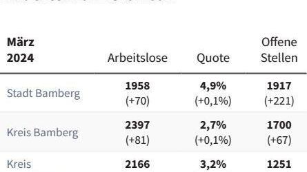 ForchheimArbeitsmarktAgentur spricht von „Jobturbogang“Nachdem die Arbeitslosigkeit sich im Februar im Landkreis Forchheim noch geringfügig erhöht hatte, legte die Frühjahrsbelebung im März den „Jobturbogang“ ein, wie die zuständige Agentur für Arbeit... 30.03.2024