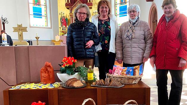 Eine Skulptur, wo der heilige Josef einen Schutzmantel über seine Frau Maria und das Jesuskind legt, war Mittelpunkt des März-Gottesdienstes der Euerfelder Senioren. Besorgt um seine Lieben hat er seine Familie sicher nach Ägypten gebracht und ist, als die Gefahr vorbei war, wieder in die Heimat zurückgekehrt. Bewegt hörten die Anwesenden die Texte und beteten um den Frieden in der Ukraine, auf der ganzen Welt, aber auch in den Orten und Familien. "Wenn das Salatöl, das wir teilen", dafür stand eine Flasche der Rarität "Sonnenblumenöl vor dem Altar und in Anlehnung an das Lied 'Wenn das Brot, das wir teilen' ein Schwarzbrot, "dann beginnen wir mit einem liebenden, helfenden Blick die Not der Menschen um uns herum zu lindern", so Diakon Kleinschnitz, der den Gottesdienst leitete, bei seinen Gedanken zur Notwendigkeit dieser Zeit. So gilt es neben der Willkommenskultur für die Unterkunft suchenden Flüchtlinge auch den Blick auf das Teilen in einem verringernden Angebot in den Supermärkten nicht aus den Augen zu verlieren. "Ich glaube, dass Gott uns in jeder Notlage so viel Widerstandskraft geben will, wie wir brauchen, dass er auf aufrichtige Gebete und verantwortliche Taten wartet und antwortet." Das Gebet von Dietrich Bonhoeffer von 1943 spannte sich wie ein großer Bogen über den Gottesdienst zum Josefstag 2022. Musikalisch begleitete Katharina Ländner Mack an der Orgel die Feierstunde. Eine Friedenstaube in den Ukrainischen Farben, eine Scheibe Brot und ein "Voraus-Osterpräsent" durfte jeder der Gottesdienstbesucher mit nach Hause nehmen.