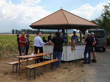 KitzingenInformationen zum Wert der Sonnenblumenölgewinnung mit Bratwurst, Baguette und Wein serviert 08.08.2022