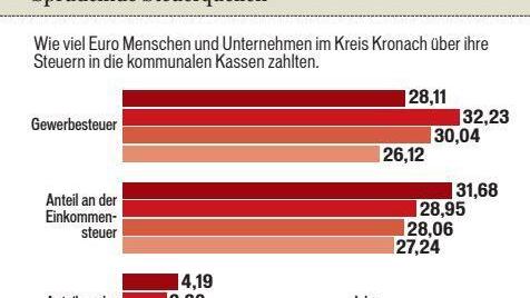 KronachSteuerquelle sprudelt etwas schwächerFür das Jahr 2017 sind die Steuereinnahmen jetzt abgerechnet. Bürger und Unternehmen zahlten 71,35 Millionen Euro in die kommunalen Kassen. Das waren 0,43 Millionen Euro weniger als ein Jahr zuvor. 3 02.01.2020