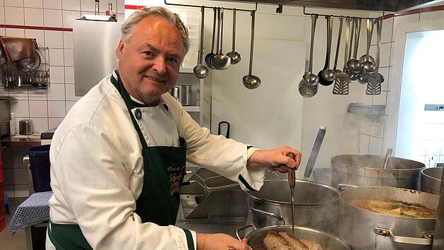 SchwarzachDie gute Tat: Joachim Schwab kocht für Seniorenheim-MitarbeiterJoachim Schwab, Gastwirt und Küchenchef vom gleichnamigen Landgasthof in Schwarzach, hat für die Mitarbeiter des Seniorenheims St. Nikolaus im Würzburger Bürgerspital ein Mittagessen gekocht. 08.05.2020