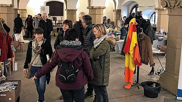 KitzingenEs ist angerichtetAuf dem Tisch stehen Teller, Tassen und Töpfe. In einem Behälter liegen jede Menge Dübel, daneben ragen die Spitzen eines Geweihs hervor. Brigitte Löffler nimmt eine Brosche in die Hand und reicht sie Karin Böhm. „Die will ich auch verkaufen.“ 2 31.01.2020