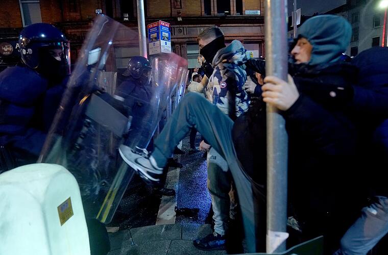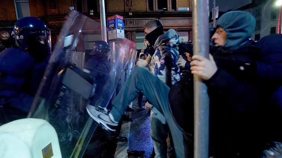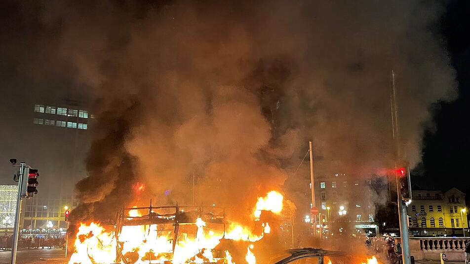 Am Abend kam es dann zu schweren Ausschreitungen in der Dubliner Innenstadt, bei denen dem irischen Rundfunksender RTÉ zufolge mehrere Busse und ein Polizeiauto angezündet wurden. Auch eine Straßenbahn soll beschädigt worden sein. Zudem seien Polizisten angegriffen und mit Flaschen und Feuerwerkskörpern beworfen worden. Mehrere Geschäfte sollen geplündert worden sein. Auf sozialen Medien war zu sehen, wie sich Randalierer Straßenschlachten mit der Polizei lieferten.