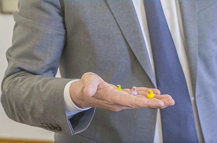 Frisch im Amt rätselt auch Oberbürgermeister Martin Ansbacher (SPD) mit. An seinem ersten Arbeitstag vor rund zwei Wochen sei er mit zwei Exemplaren auf seinem Computer begrüßt worden. Wer die Enten in seinem Rathaus versteckt, weiß auch das neue Stadtoberhaupt nicht. «Ich find's lustig, aber ich selber war es nicht», sagt Ansbacher.