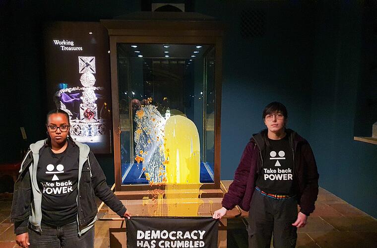 Es ist ein normaler Samstagmorgen, ehrfürchtig schreiten Dutzende Touristen durch die abgedunkelten Ausstellungsräume mit den britischen Kronjuwelen im Tower of London. Doch plötzlich packt jemand ein Kuchenblech aus und verteilt den Inhalt auf der Vitrine der Imperial State Crown. Ein zweiter Aktivist schüttet eine Flüssigkeit hinterher, mutmaßlich Vanillesoße. Symbolischer kann eine Protestaktion das Vereinigte Königreich kaum treffen.
