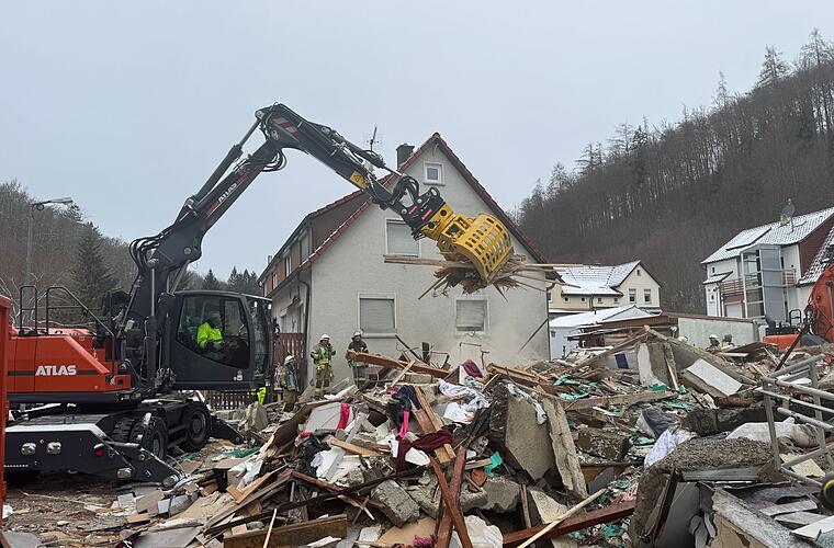 Lange ist unklar, ob vor dem Einsturz Bewohner in dem Haus waren. Die Trümmerschichten müssen Stück für Stück von Hand abgetragen werden. Weil Menschen unter Steinen und Holz vermutet werden, könnten keine Maschinen zum Einsatz kommen, erläutert die Feuerwehr. Auch sonst ist der Einsatz schwierig. Zwischendurch setzt Schneefall ein und der Winterdienst muss gegen die spiegelglatte Straße weiterhelfen.