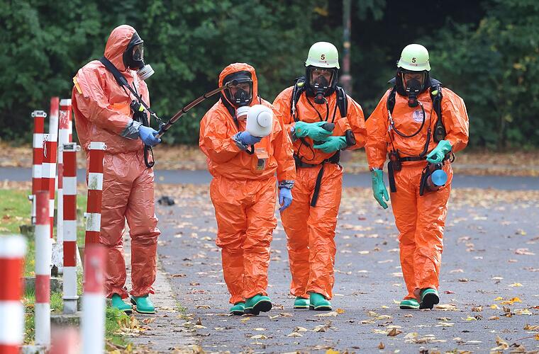 Ein Auto wurde von einem weißen Zelt abgedeckt. In dem Fahrzeug saßen nach Angaben der Feuerwehr zwei zivile Polizeibeamte und eine weitere Person. Keiner von ihnen sei kontaminiert gewesen, sagte der Feuerwehrsprecher. Das Fahrzeug fuhr später mit den Insassen ab. Um wen es sich bei der dritten Person handelte, war zunächst unklar.
