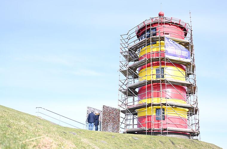 Der Pilsumer Leuchtturm wird neu gestrichen. Die rot-gelben Ringe erzählen auch die Geschichte des Bauwerks – was ein Sanitär-Großhandel damit zu tun hat und warum der Turm sogar ein Bankkonto hat.